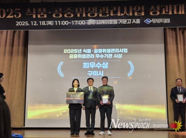뉴스펀치 김길룡 기자 | 구미시는 지난 18일 더케이호텔 경주에서 열린 ‘2025년 식품·공중위생관리사업 성과대회’에서 공중위생사업 최우수와 식품안전관리 특별상을 동시에 수상했다.