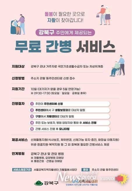 뉴스펀치 김완규 기자 | 서울 강북구는 질병이나 사고로 일시적인 돌봄이 필요한 저소득 구민을 위해 ‘무료 간병 서비스’를 지원한다.