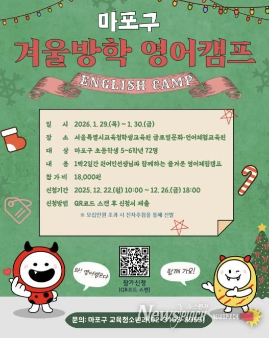 뉴스펀치 김완규 기자 | 마포구는 겨울방학을 맞아 관내 초등학교 5~6학년 학생 72명을 대상으로 2026년 1월 29일부터 30일까지 1박 2일 일정의 겨울방학 영어캠프를 운영한다.