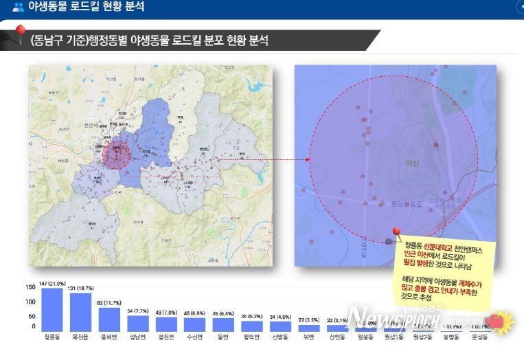 뉴스펀치 김길룡 기자 | 천안시 동남구는 야생동물 로드킬을 방지하기 위해 빅데이터 기반의 관리체계를 구축했다고 19일 밝혔다.