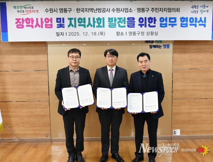 뉴스펀치 김길룡 기자 | 수원특례시 영통구는 지난 18일, 한국지역난방공사 수원지사, 구 주민자치협의회와 상호 협력을 바탕으로 지역 미래인재 육성을 위한 장학사업 협약을 체결했다.