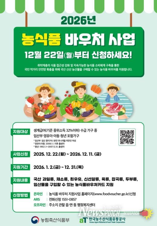 2025년 수급 가구 중 12월 22일 기준 지원 자격요건을 충족하는 경우 별도의 신청 절차 없이 자동으로 신청 처리되며, 2026년 신규 신청 대상자는 22일부터 주민등록 주소지 관할 행정복지센터 방문 또는 농식품 바우처 누리집, 자동응답전화 서비스(1551-0857)를 통해 연중 신청할 수 있다.