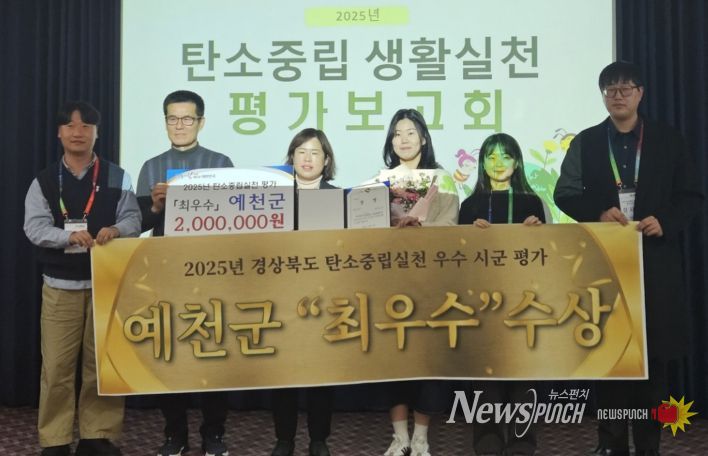 뉴스펀치 김길룡 기자 | 예천군은 19일 구미 호텔금오산에서 열린 ‘2025년 탄소중립실천 우수시군 평가보고회’에서 ‘최우수상’을 수상했다.