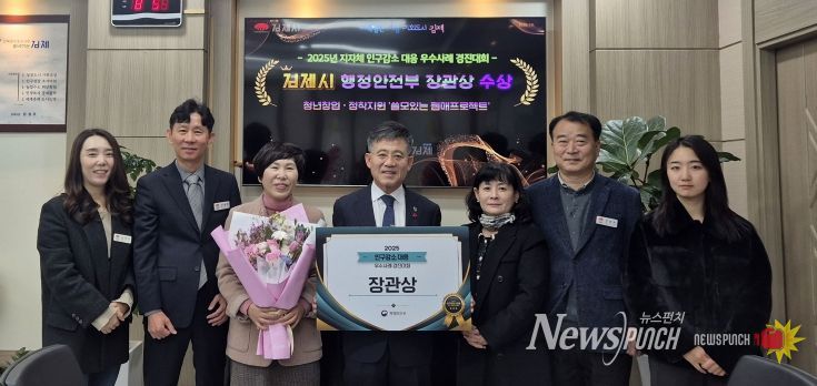 뉴스펀치 정홍균 기자 | 김제시는 지난 18일 행정안전부가 주관한 '2025년 인구감소 대응 우수사례 경진대회'에서 ‘청년창업·정착지원, 쓸모있는 찜매 프로잭트’로 행정안전부장관상을 수상하며, 4년 연속 수상이라는 성과를 거두고 인구감소 대응 분야의 대표 우수 지자체로 자리매김했다.