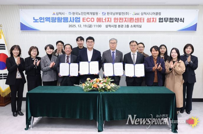 뉴스펀치 김길룡 기자 | 삼척시는 12월 19일 한국노인인력개발원, 한국남부발전(주) 삼척빛드림본부, 삼척시니어클럽과 함께 신규 어르신 일자리 창출사업으로 ‘Eco에너지 안전지원센터’ 운영을 위한 업무협약을 체결했다.