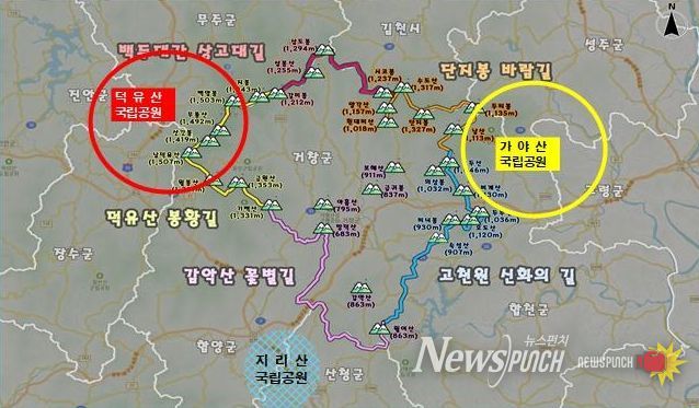 테마는 △단지봉 바람길(수행과 명상) △고천원 신화의 길(고천원 신화와 온천힐링) △감악산 꽃별길(합천호 전망과 별빛 트레킹) △덕유산 봉황길(1,500m급 고봉 도전) △백두대간 상고대길(상고대와 약초체험) 등으로 구성된다.