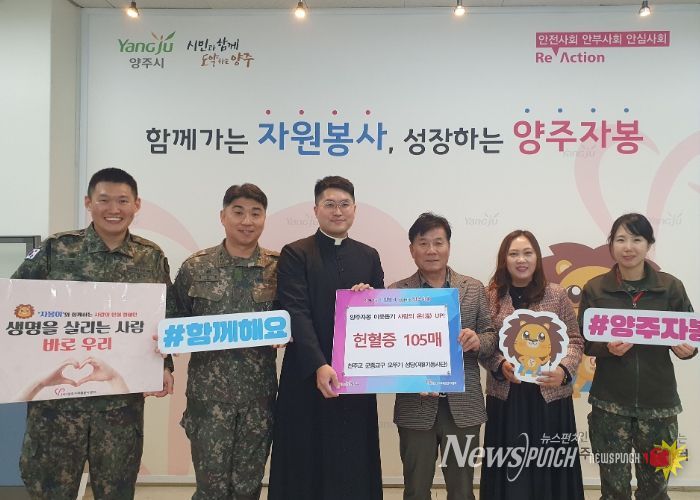 뉴스펀치 김길룡 기자 | 양주시자원봉사센터는 천주교 군종교구 오뚜기 성당(제8기동사단) 오형훈 군종신부와 군 장병들이 연말을 맞아 헌혈증 105장을 기부했다고 밝혔다.
