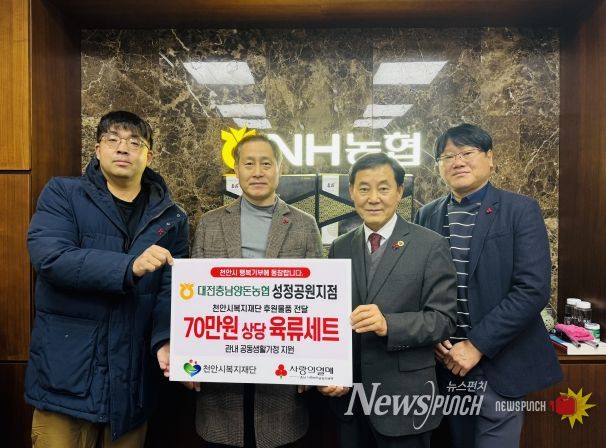 뉴스펀치 김길룡 기자 | (재)천안시복지재단은 19일 대전충남양돈농협 성정공원지점이 취약계층 아동·청소년을 위해 70만 원 상당의 육류세트를 기탁했다고 밝혔다.