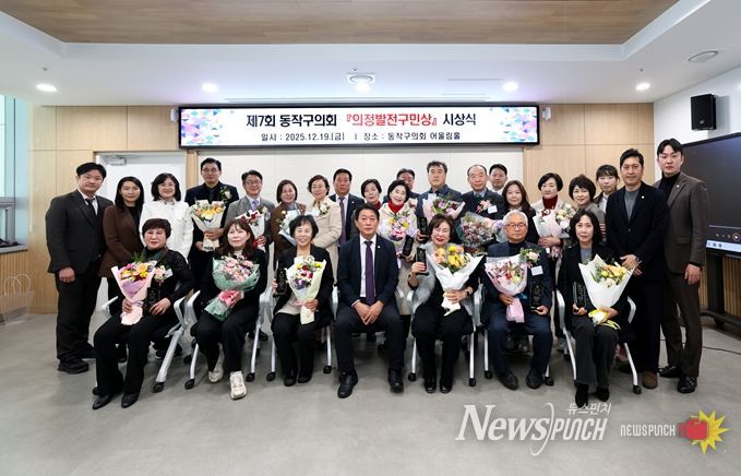 뉴스펀치 김완규 기자 | 동작구의회는 12월 19일 의회 3층 어울림홀에서 ‘제7회 동작구의회 의정발전 구민상 시상식’을 개최하고, 지역사회 발전과 지방자치 구현에 기여해 온 구민과 단체의 공로를 기렸다.