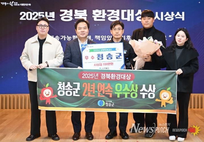 뉴스펀치 김길룡 기자 | 청송군은 22일 열린 ‘2025년 경북환경대상’에서 2년 연속 우수상을 수상했다고 밝혔다.