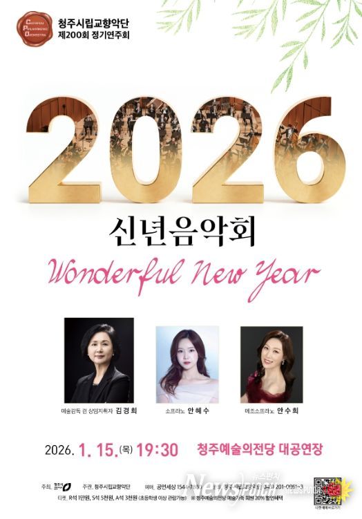 뉴스펀치 김길룡 기자 | 청주시립교향악단(예술감독 겸 상임지휘자 김경희)은 오는 2026년 1월 15일 오후 7시 30분 청주예술의전당 대공연장에서 제200회 정기연주회 ‘2026 신년음악회–Wonderful New Year’공연을 선보인다.