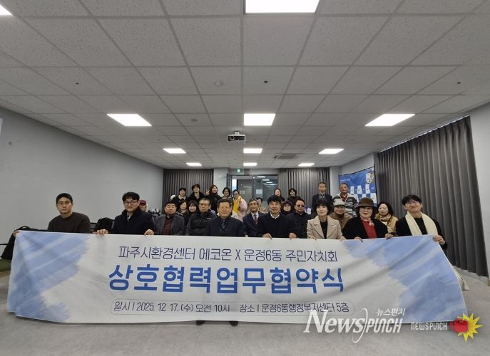 뉴스펀치 김길룡 기자 | 운정6동 주민자치회는 12월 17일 오전 10시, 운정6동 행정복지센터에서 파주시환경센터 ‘에코온’과 ‘지역 환경 의제 실천 및 기후행동 협력을 위한 업무협약’을 체결하고, 이어 마을 소식지 '초롱꽃향기로' 2호 제작 성과공유회를 개최했다.