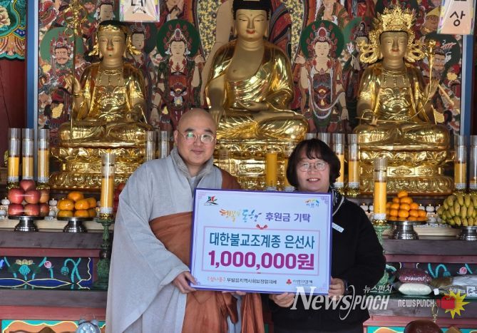 뉴스펀치 김길룡 기자 | 이천시 부발읍 산촌리에 위치한 대한불교조계종 은선사는 지난 12월 22일, 동지를 맞아 부발읍행정복지센터(읍장 이은미)에 후원금 100만 원을 기탁했다.