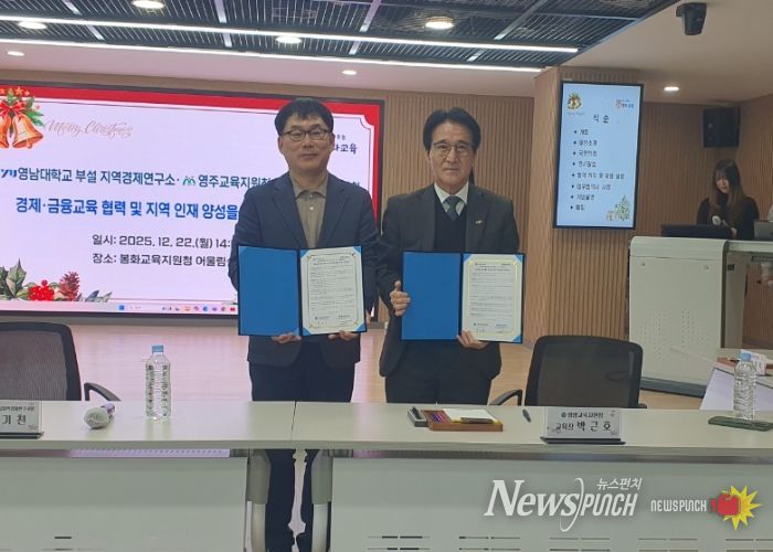 뉴스펀치 김길룡 기자 | 경상북도영양교육지원청은 2025년 12월 22일 14:00, 봉화교육지원청 대회의실에서 '영양교육지원청-영남대 지역연구소, 경제·금융 교육 협력 및 지역 인재 양성 MOU'를 체결했다.