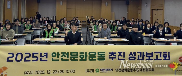 뉴스펀치 김길룡 기자 | 대전시는 23일 대전시청 세미나실에서 안전문화운동추진 대전협의회 소속 기관 및 단체 관계자 100여 명이 참석한 가운데 2025 안전문화운동 추진 성과보고회를 개최했다.