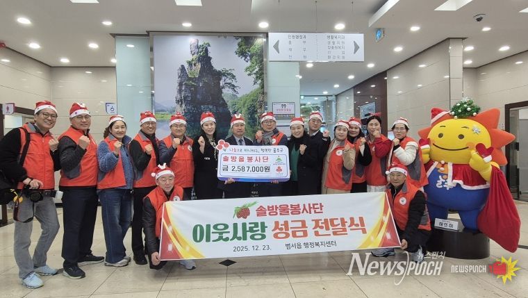 뉴스펀치 김길룡 기자 | 솔방울봉사단(단장 이해준)이 23일 울주군 범서읍 행정복지센터에서 지역 취약계층을 위한 이웃돕기 성금 258만7천원을 전달했다.