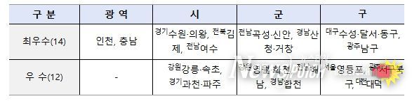 종합점수 산정결과, 인천, 충남 등 광역 지자체 2곳, 경기 수원, 전남 곡성, 대구 수성 등 기초 지자체 24곳 등 총 26곳이 우수 지방정부로 선정됐다.