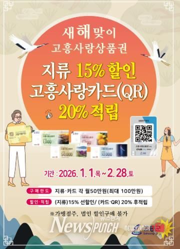 뉴스펀치 김길룡 기자 | 고흥군은 새해를 맞아 군민의 장보기 부담을 대폭 낮추고 지역경제에 즉각적인 활력을 불어넣기 위해, 내년 1월부터 2월까지 두 달간 ‘새해맞이 고흥사랑상품권 특별할인 행사’를 추진한다고 밝혔다.