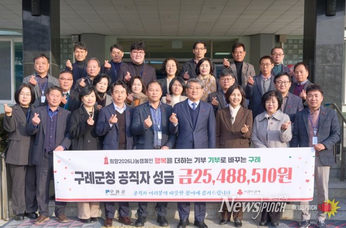 뉴스펀치 김길룡 기자 | 구례군은 군 소속 공직자들이 자발적으로 참여해 모은 성금 25,488,510원을 희망2026나눔캠페인에 기탁하며 연말연시 이웃사랑 실천에 동참했다고 밝혔다.