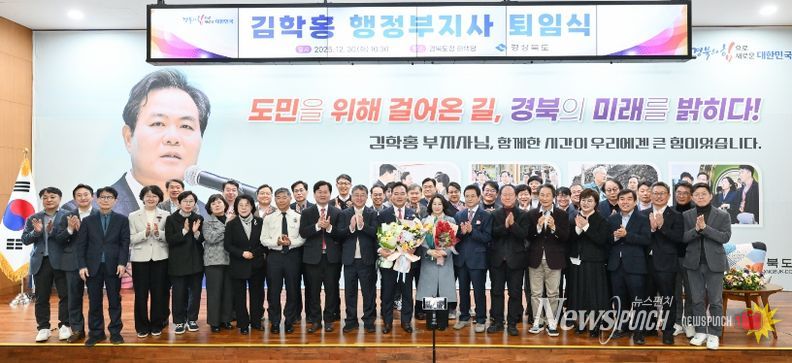 뉴스펀치 김길룡 기자 | 김학홍 경상북도 행정부지사가 30일 도청에서 퇴임식을 갖고, 3년 2개월간의 행정부지사 임기를 끝으로 33년간의 공직 생활을 마무리했다.