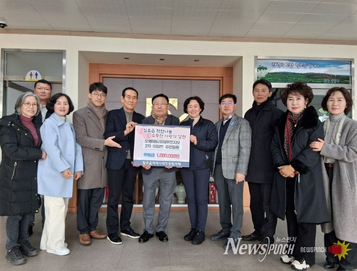 뉴스펀치 김길룡 기자 | 오룡에듀포레푸르지오 1·2차 아파트 입주자대표회의(1차 대표 김준보, 2차 대표 임윤호)는 지역 내 취약계층 지원과 복지 증진을 위해 일로읍 지역사회보장협의체(공동위원장 김준연, 김진만)에 후원금을 전달했다.