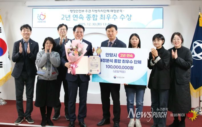 뉴스펀치 김길룡 기자 | 안양시는 행정안전부에서 실시한‘2025년(2024 회계연도) 지방재정분석’에서 종합점수 ‘가’등급을 받아 2년 연속‘종합 최우수’지자체로 선정됐다.