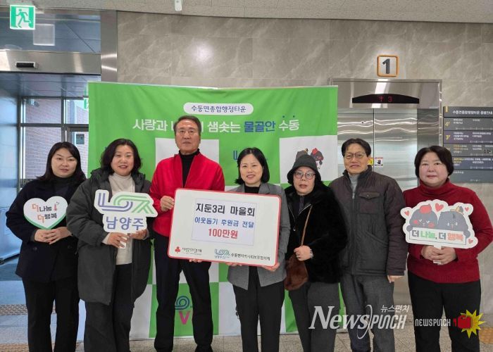 뉴스펀치 김길룡 기자 | 남양주시는 30일 수동면 지둔3리 마을회가 지역 내 어려운 이웃을 위한 후원금 100만 원을 경기사회복지공동모금회를 통해 수동면 지역사회보장협의체에 지정 기탁했다고 밝혔다.