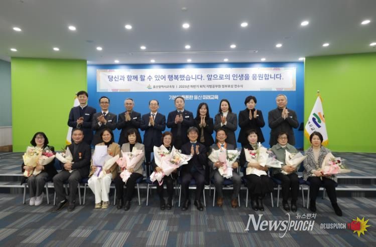 뉴스펀치 김길룡 기자 | 울산광역시교육청은 30일 외솔회의실에서 2025년 하반기 정년퇴직자 등 퇴직 지방공무원 15명에게 정부포상을 전수했다.