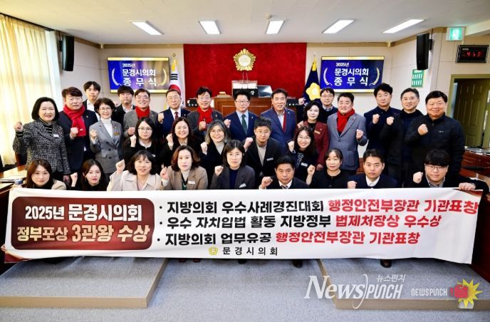 뉴스펀치 김길룡 기자 | 문경시의회는 12월 24일 행정안전부로부터‘2025년도 업무 유공 지방의회’로 선정되어 행정안전부 장관 표창을 수상했다. 이는 경북 도내 23개 지방의회 중 유일하게 문경시의회가 수상했으며, 지방자치제도를 총괄하는 행정안전부가 지방의회의 활동과 실적에 대하여 엄격한 심사를 거쳐 평가한 결과라는 측면에서 매우 뜻깊은 상으로 평가된다.