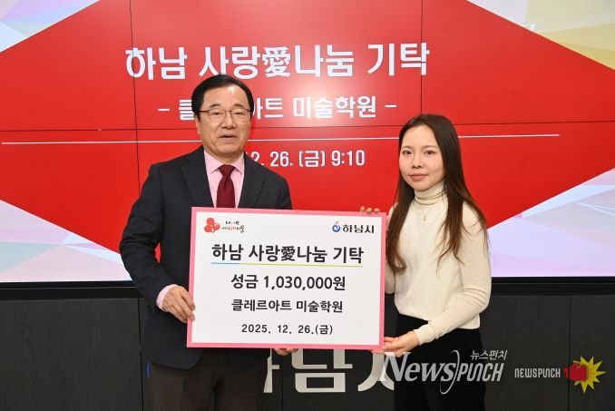 뉴스펀치 김길룡 기자 | 하남시는 지난 26일, 미사3동에 위치한 클레르아트 미술학원(원장 김수빈)이 작품 전시회 수익금(103만원)을 ‘하남 사랑愛나눔’ 성금으로 기탁하며, 나눔을 실천했다고 밝혔다.