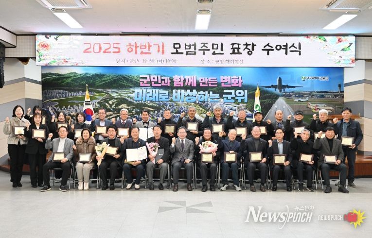 뉴스펀치 김길룡 기자 | 군위군은 30일 오전 10시 군청 대회의실에서 수상자와 가족, 부서장 등 50여 명이 참석한 가운데 2025년도 하반기 모범 주민에 대한 표창 수여식을 개최했다.