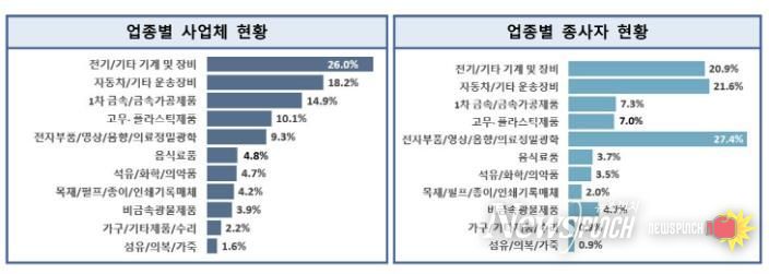 조사 결과, 아산시 제조업은 ‘전기/기타 기계 및 장비업’이 26.0%로 가장 높은 비중을 차지했다. 종사자 기준으로는 ‘전자부품/영상/음향/의료정밀광학업’이 27.4%로 가장 많았다.