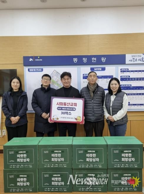 뉴스펀치 김길룡 기자 | 시흥시 정왕1동 행정복지센터에 지난 12월 30일 시화동산교회가 방문해 관내 어려운 이웃을 돕기 위해 ‘희망상자’ 30개를 전달했다.