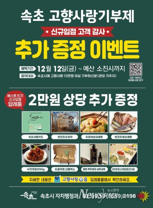 이벤트에는 12월에 새롭게 추가된 신규 답례품과 그간 많은 인기를 받아 온 오징어순대, 반건조 생선·오징어, 젓갈류, 속초사랑상품권이 포함돼 기부자 만족도를 높이는 동시에 신규 품목의 인지도 확산과 지역경제 활력 제고에도 도움이 될 것으로 기대된다.