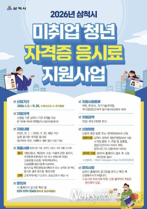 뉴스펀치 김길룡 기자 | 삼척시는 미취업 청년의 자격증 취득에 따른 경제적 부담을 완화하고 취업역량 강화를 지원하기 위해 '2026년 삼척시 미취업 청년 자격증 응시료 지원사업'을 추진한다고 밝혔다.