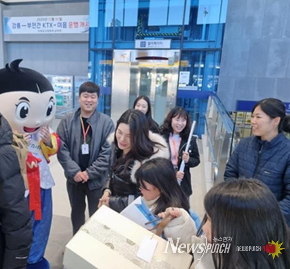 뉴스펀치 김길룡 기자 | 삼척관광문화재단과 삼척시는 동해선 개통 1주년과 KTX-이음 삼척역 첫 열차 운행을 기념해 삼척을 방문한 철도 이용객을 대상으로 환영행사와 다양한 이벤트를 공동으로 진행했다고 밝혔다.