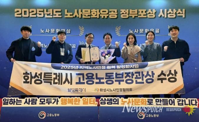 뉴스펀치 김길룡 기자 | 화성특례시는 지난 30일 고용노동부 주관으로 열린 '2025년 노사문화유공 정부포상 시상식’에서 ‘지역노사민정 협력 유공’단체부문 고용노동부장관 표창을 수상했다고 31일 밝혔다.