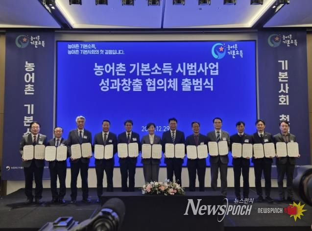 행사에서는 기본사회 강연을 시작으로 농어촌기본소득 시범사업 추진계획과 지역별 특화모델 운영 방향, 연구단 구성·운영 및 정책평가 계획이 공유됐다. 이어 농식품부–경인사연–10개 군이 참여하는 업무협약 체결과 협의체 출범 퍼포먼스, 기념촬영이 진행됐다.