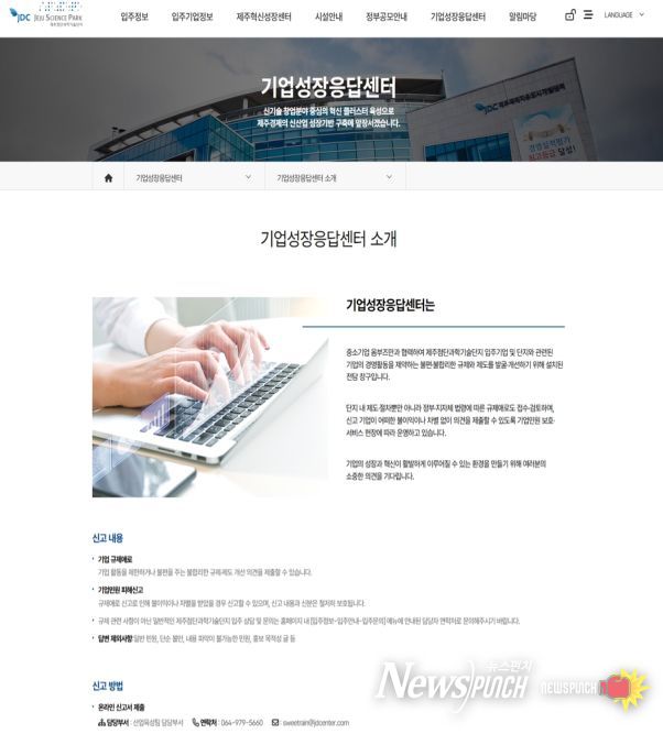 뉴스펀치 김길룡 기자 | 제주국제자유도시개발센터는 제주첨단과학기술단지 입주기업과 관련 기업의 규제·경영 애로사항을 체계적으로 지원하기 위해 ‘기업성장응답센터’를 온라인으로 개소하고 본격 운영에 들어갔다고 밝혔다.