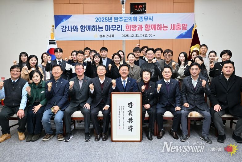 뉴스펀치 김길룡 기자 | 완주군의회는 31일 문화강좌실에서 11명 군의원 전원과 의회사무국 직원 등 40여 명이 참석한 가운데 2025년도 종무식을 개최했다.