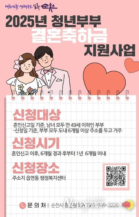 뉴스펀치 김길룡 기자 | 순천시는 청년세대의 결혼 초기 경제적 부담을 줄이고 안정적인 지역 정착을 돕기 위해 추진한 ‘2025년 청년부부 결혼축하금 지원사업’을 성공적으로 마무리했다고 밝혔다.
