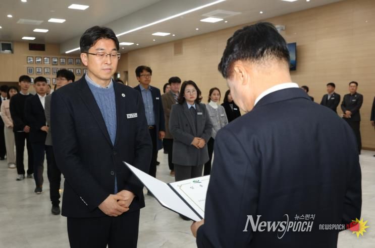 뉴스펀치 김길룡 기자 | 고성군은 12월 29일 고성군청 대회의실에서 2026년 상반기 정기인사에 따른 승진자 및 부서장 전보자 54명에게 임용장을 수여했다.
