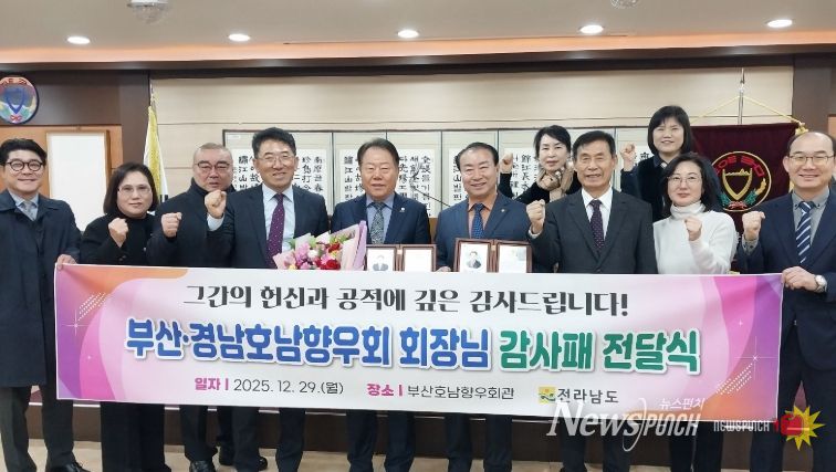 뉴스펀치 김길룡 기자 | 전라남도는 부산호남향우회관에서 각별한 애향심으로 고향사랑실천에 앞장 선 부산호남향우회 조용서 회장과 경남호남향우회 이병철 회장에게 지난 12월 29일 감사패를 전달했다고 밝혔다.