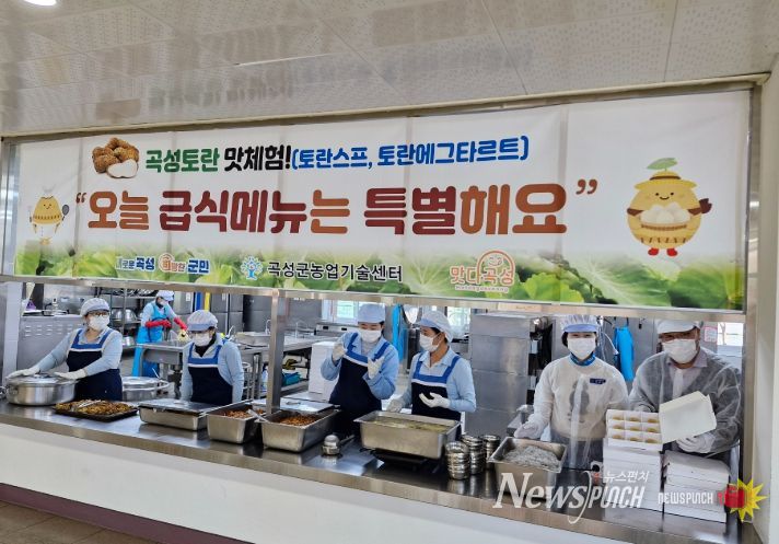뉴스펀치 김길룡 기자 | 곡성군은 지난 24일, 30일 2일간 지역 특화 농산물인 토란의 소비 확대와 가공식품의 다양화를 위해 토란스프, 토란에그타르트를 개발해 관내 소재한 곡성중앙초등학교 어린이급식과 연계한 시식 홍보활동을 진행했다고 31일 밝혔다.
