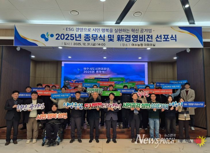 뉴스펀치 김길룡 기자 | 여수시도시관리공단은 31일 공단 대회의실에서 ‘新 경영비전 선포식’을 개최하고, 향후 5년간 공단이 나아갈 새로운 경영 철학과 조직 혁신 의지를 대내외에 공식적으로 밝혔다.