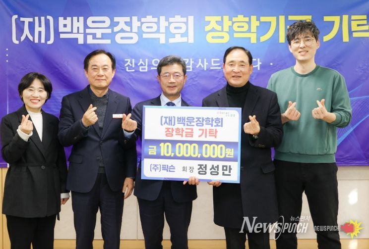 뉴스펀치 김길룡 기자 | 재단법인 백운장학회는 12월 31일 시청 만남실에서 정성만 (주)픽슨 회장을 비롯한 임직원이 참석한 가운데 장학금 기탁식을 개최했다.