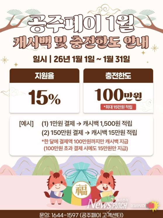 이에 따라 충전 시기와 관계없이 월 100만 원 한도 내에서 공주페이로 결제한 금액의 15%가 환급금으로 제공된다. 이용자는 한 달에 최대 15만 원까지 혜택을 받을 수 있다.