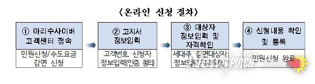 신청방법은 방문신청 또는 온라인신청이 가능하다. 방문 신청은 1월 12일부터 감면받을 주소지 관할 동주민센터에서 우선 접수하며, 온라인 신청은 3월 3일부터 서울아리수본부 누리집 내 아리수 사이버고객센터에서 할 수 있다.