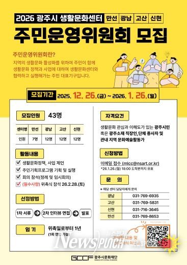 뉴스펀치 박상훈 기자 | (재)광주시문화재단은 광주시 생활문화센터(만선·광남·고산·신현)에서 2026년에 활동할 주민운영위원회 위원을 통합 공개 모집한다고 밝혔다.