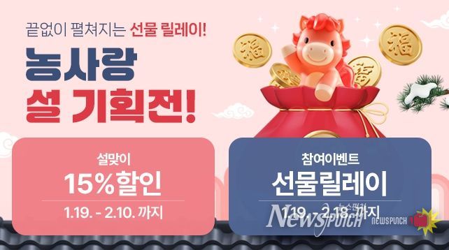 뉴스펀치 강영선 기자 | 충남도 대표 농특산물 온라인 쇼핑몰 충남농사랑이 한 해의 시작을 알리는 설 명절을 맞아 도내 농특산물의 소비 촉진, 지역 농가의 소득 증대와 함께 도민의 합리적이고 건강한 소비를 위해 19일부터 2월 10일까지 설 명절 기획전을 진행한다.